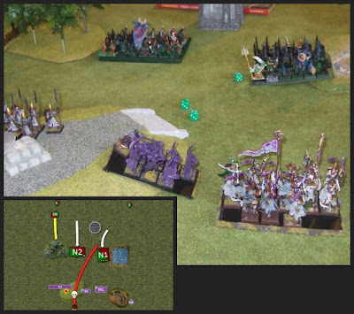 Die Echsenreiter wittern ihre Chance und griffen die Drachenprinzen in der Front an. Slann und Skinkplänkler betreten das Feld,